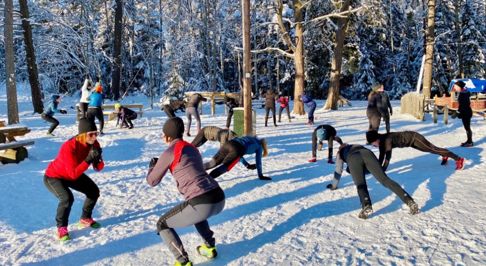 Ta på dig kläder efter säsongens väder. Lager på lager rekommenderas! Vi håller oss alltid längre tid på ett och samma ställe under passets gång vilket innebär att du kan lägga kläder åt sidan vid behov. Vid minusgrader kan det vara bra med dubbla handskar, t.ex. skidvantar ovanpå ett par tunnare, då vi tränar en del med händerna på marken samt lyfter stenar. Broddar på skorna eller dubbskor rekommenderas så här års! Det går även jättebra att ta med ett ligg- eller sittunderlag att träna på.